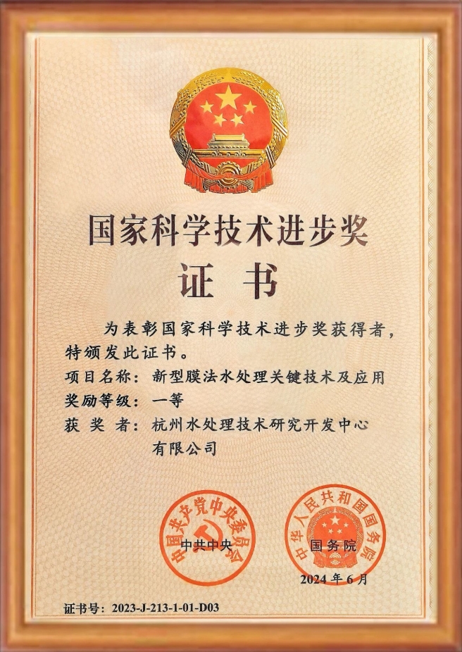 作為中國(guó)膜分離技術(shù)的發(fā)源地,杭州水處理此次為第二次獲得國(guó)家科學(xué)技術(shù)進(jìn)步獎(jiǎng)一等獎(jiǎng)。早在1992年,杭州水處理就憑借“國(guó)產(chǎn)反滲透膜裝置及工程技術(shù)開發(fā)”項(xiàng)目獲得該獎(jiǎng)項(xiàng)。此外,杭州水處理還曾獲得國(guó)家技術(shù)發(fā)明獎(jiǎng)二等獎(jiǎng)、國(guó)家科學(xué)技術(shù)進(jìn)步獎(jiǎng)三等獎(jiǎng)。