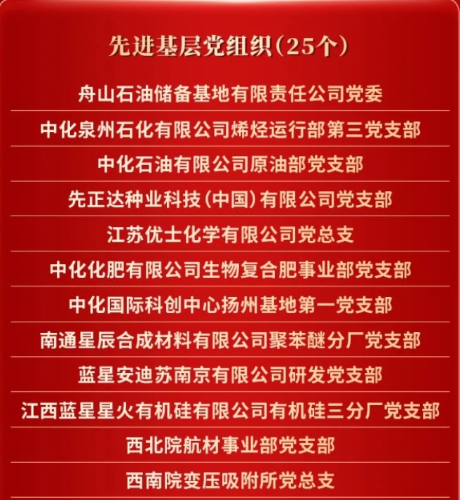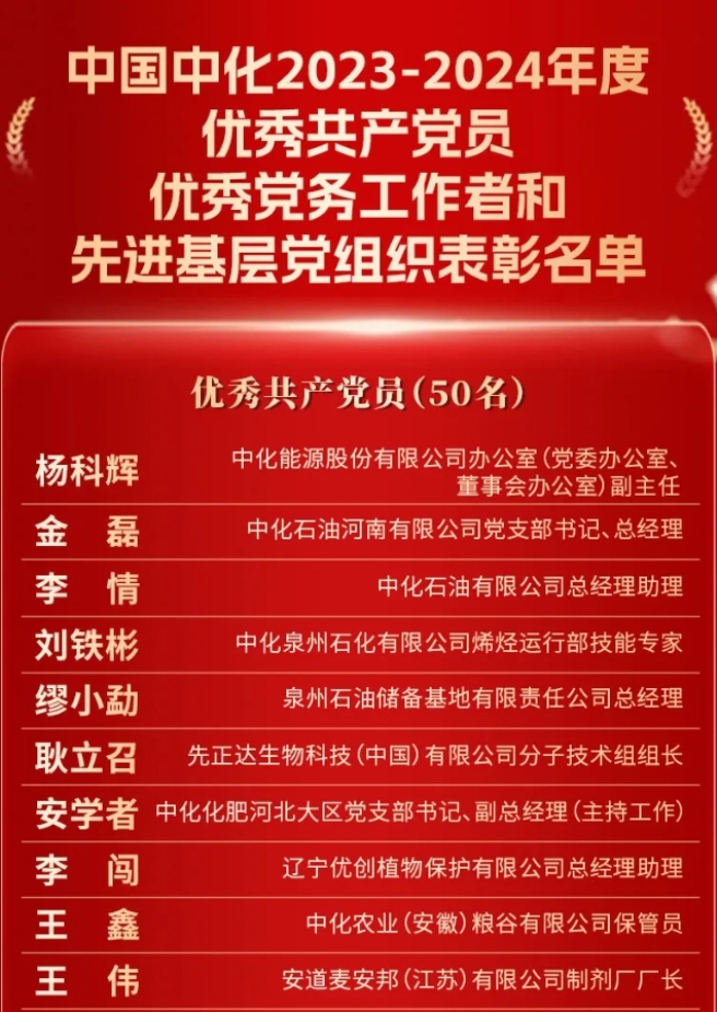 2023年以來,中國中化各級黨組織和廣大共產(chǎn)黨員堅持以習(xí)近平新時代中國特色社會主義思想為指導(dǎo),全面貫徹落實黨的二十大精神,深入開展學(xué)習(xí)貫徹習(xí)近平新時代中國特色社會主義思想主題教育,聚焦公司改革發(fā)展和黨的建設(shè),在科技創(chuàng)新、提質(zhì)增效、扭虧治困、合規(guī)經(jīng)營、安全生產(chǎn)、重大項目建設(shè)等重點任務(wù)中,充分發(fā)揮黨組織戰(zhàn)斗堡壘作用和黨員先鋒模范作用,涌現(xiàn)出一大批先進典型。中國中化黨組決定對公司100個先進集體和個人進行表彰,授予中國中化“兩優(yōu)一先”榮譽稱號。