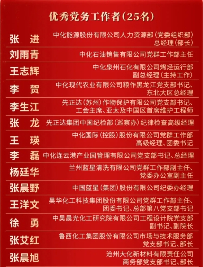 2024年6月27日,國務(wù)院國資委黨委召開中央企業(yè)“兩優(yōu)一先”表彰大會,決定對中央企業(yè)優(yōu)秀共產(chǎn)黨員、優(yōu)秀黨務(wù)工作者和先進基層黨組織進行表彰,激勵中央企業(yè)各級黨組織和廣大共產(chǎn)黨員在全面推動國資央企高質(zhì)量發(fā)展的新征程中創(chuàng)先爭優(yōu)、建功立業(yè)。中國中化共有5個先進集體和個人榮獲中央企業(yè)“兩優(yōu)一先”榮譽稱號。