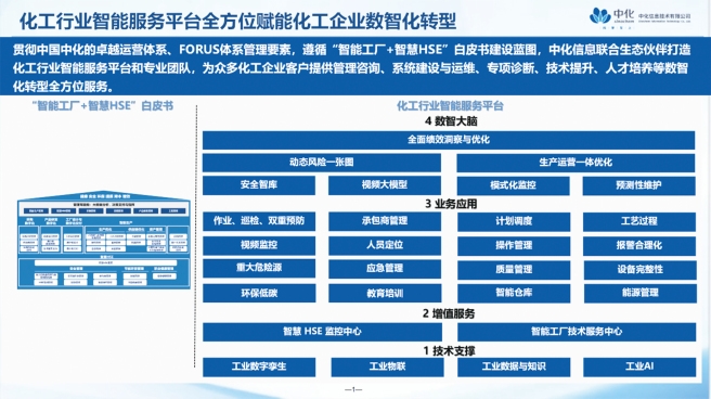 化工行業(yè)智能服務(wù)平臺(tái):化工行業(yè)智能服務(wù)平臺(tái)可為眾多化工企業(yè)客戶提供管理咨詢、系統(tǒng)建設(shè)與運(yùn)維、專項(xiàng)診斷、技術(shù)提升、人才培養(yǎng)等數(shù)智化轉(zhuǎn)型全方位服務(wù)。中化信息所屬藍(lán)星智云針對(duì)化工生產(chǎn)的特點(diǎn),從工藝分析入手,全方位覆蓋化工企業(yè)生產(chǎn)過程的感知、分析、安全、控制、優(yōu)化及培訓(xùn)等領(lǐng)域。目前,化工行業(yè)智能服務(wù)平臺(tái)已全面服務(wù)支撐中國(guó)中化“智能工廠+智慧HSE”建設(shè)應(yīng)用,并向行業(yè)輸出推廣。