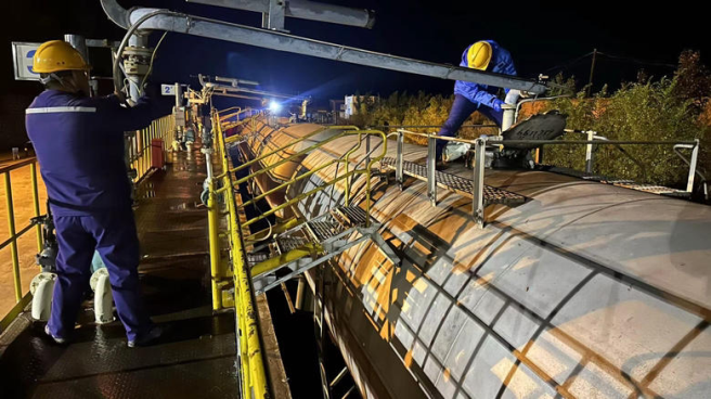 國慶期間,中化東北石油油庫班組奮戰(zhàn)在油品接卸一線。班組人員嚴(yán)格遵循操作規(guī)程,插好鶴管,蓋好滅火毯,啟泵后時(shí)刻觀察壓力和液位變化,確保作業(yè)安全。