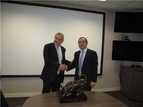 10月17日至18日,中化國際總經(jīng)理覃衡德率團(tuán)拜訪了位于法國克萊蒙費(fèi)朗的米其林輪胎公司總部,與米其林集團(tuán)高級副總裁兼首席采購官Luc Minguet先生等高層會晤,雙方就共同推進(jìn)在天然橡膠及橡膠化學(xué)品領(lǐng)域的戰(zhàn)略合作、踐行企業(yè)社會責(zé)任、推動全球橡膠行業(yè)綠色可持續(xù)發(fā)展等話題進(jìn)行了深入交流,并形成廣泛共識。雙方還就中國經(jīng)濟(jì)發(fā)展、2016年輪胎行業(yè)狀況、中國企業(yè)全球化布局和并購等焦點問題交換了意見。新加坡合盛公司CEO Robert Meyer、圣奧化學(xué)CEO蘇賦等相關(guān)人員陪同出訪。