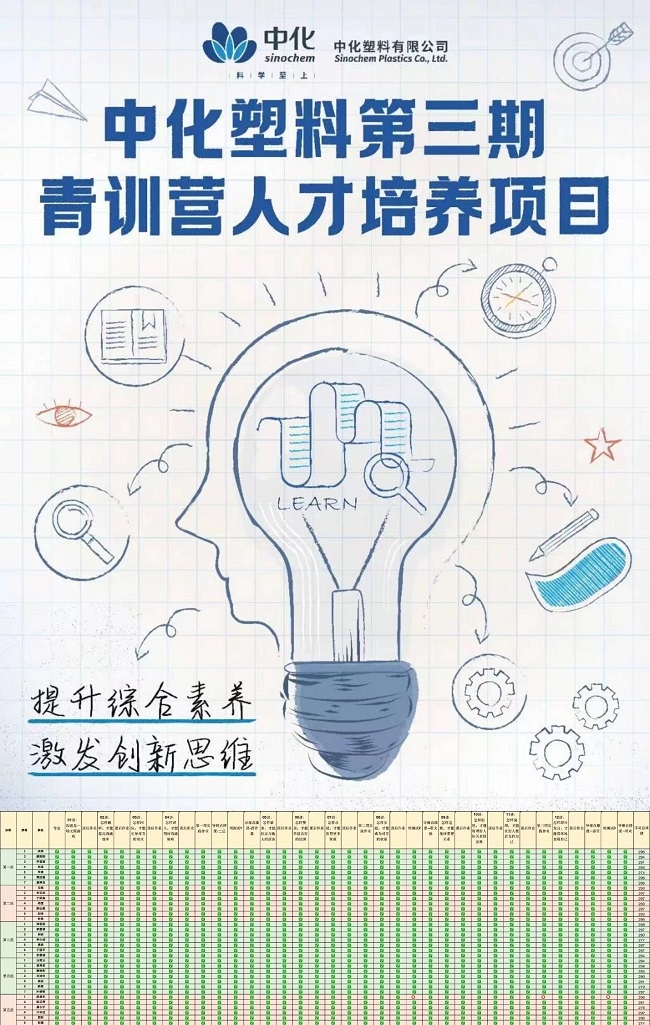 為進(jìn)一步落實(shí)中化塑料人才興企計(jì)劃,公司啟動(dòng)了第三期青訓(xùn)營(yíng)人才培養(yǎng)項(xiàng)目,受疫情影響,本期青訓(xùn)營(yíng)分為兩階段實(shí)施,第一階段為2022年10月線上自主學(xué)習(xí),第二階段為2023年4-5月線下主題培訓(xùn)及課題研究。中化塑料青訓(xùn)營(yíng)是公司針對(duì)青年人才培養(yǎng)制定的專門培養(yǎng)計(jì)劃,每3-5年開辦一期,目前為第三期,旨在通過(guò)集訓(xùn)的形式,挖掘人才、開拓視野,激發(fā)青年人才對(duì)公司事業(yè)的參與度,使青年員工更深入的了解公司戰(zhàn)略發(fā)展方向,同時(shí)通過(guò)參與課題研究,展示自我,凝聚團(tuán)隊(duì)力量,將個(gè)人能力提升與組織長(zhǎng)遠(yuǎn)發(fā)展有機(jī)結(jié)合,激發(fā)青年員工工作積極性與創(chuàng)造性。來(lái)自公司各業(yè)務(wù)與職能部門的34名高潛青年員工參加了本期青訓(xùn)營(yíng)。