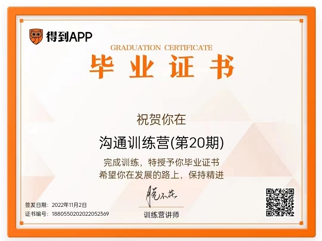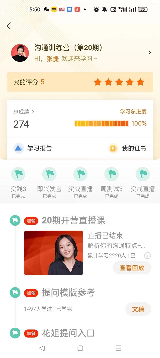 第一階段為《溝通訓(xùn)練營(yíng)》課程。該課程以提高個(gè)人效能為目標(biāo),通過(guò)21天線上APP學(xué)習(xí)與小組討論,采用“傾聽、回應(yīng)、破冰、贊美、說(shuō)服”等12個(gè)高頻溝通場(chǎng)景和溝通主題,12講視頻課程配合12講測(cè)試,每周一場(chǎng)共計(jì)3場(chǎng)直播課程,3次場(chǎng)景化大作業(yè)訓(xùn)練,4次測(cè)評(píng),有效幫助參訓(xùn)人員以實(shí)用為目的,理論學(xué)習(xí)和實(shí)踐結(jié)合,降低溝通成本,提升工作效率。大家認(rèn)真學(xué)習(xí),全部完成各階段學(xué)習(xí)測(cè)試及作業(yè)訓(xùn)練任務(wù)。