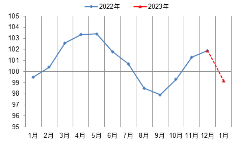 2023年1月份,受疫情和春節(jié)假日因素影響,化工下游需求收縮,綜合測(cè)得化工行業(yè)綜合景氣指數(shù)初值為99.2點(diǎn),較12月份下降2.6點(diǎn)。2022-2023年中國(guó)化工行業(yè)景氣指數(shù)走勢(shì)見(jiàn)圖1。